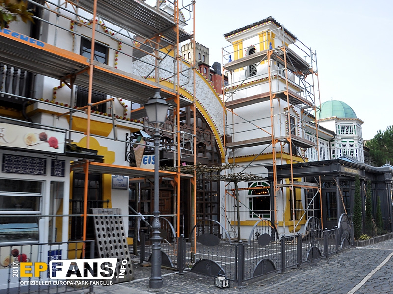 Doch auch im Außenbereich des spanischen Themenbereiches wird investiert. So sind aktuell zahlreiche Gebäude eingerüstet, damit sie renoviert werden können.