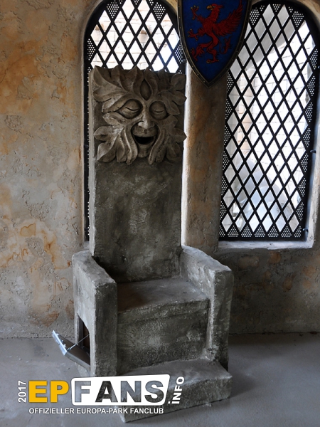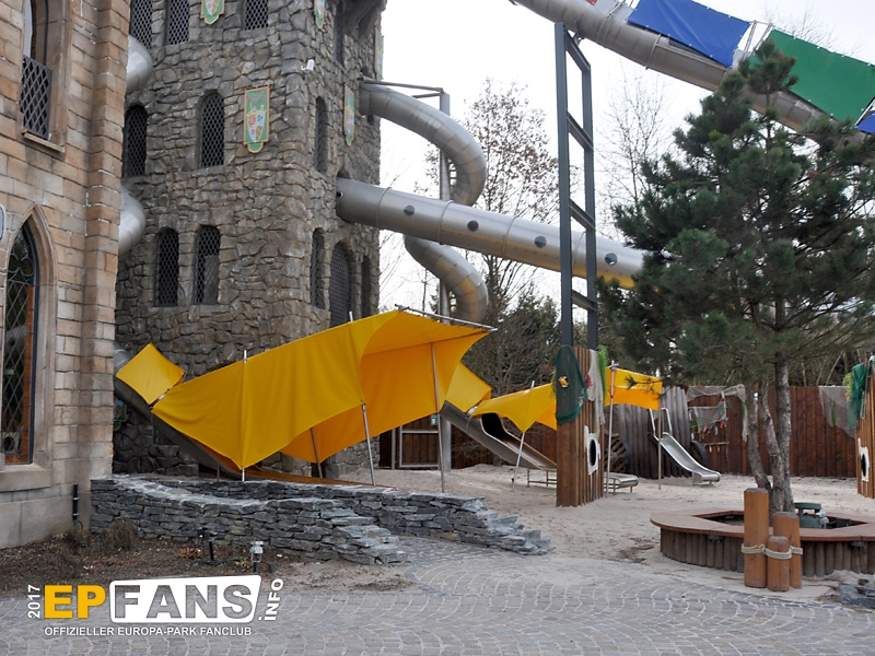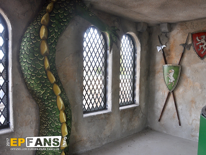 In diesem Bereich gibt es übrigens auch Fortschritte bei der Thematisierung: Am Fuße des Rutschenturmes beginnt nun ein Drachen-Relief, das sich Stockwerk für Stockwerk nach oben schlängelt, um von ganz oben (als Rutsche) wieder nach unten zu führen. Dadurch wird das Rutschenende als Drachenkopf erst richtig stimmig!
