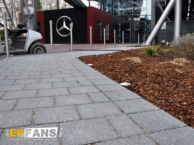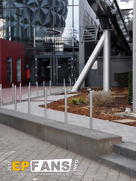 Könnt ihr weit springen? Denn jetzt geht es im hohen Bogen an ein anderes Ende des Parks, nämlich zum SilverStar. Vor der Kulisse der neuen EP-Arena sorgt zukünftig eine kleinere Neuheit für weniger Stau auf dem Weg: Die SilverStar-Warteschlange wurde nach rechts verlegt. Auch wenn es auf den ersten Blick nicht so aussieht, ist der neue Wartebereich mit fast gleich vielen "Warteschlangenmetern" ausgestattet wie der bisherige Platz direkt vor dem Eingang. Und wenn es mal richtig voll wird, dann kann der alte Bereich natürlich weiterhin zusätzlich genutzt werden.