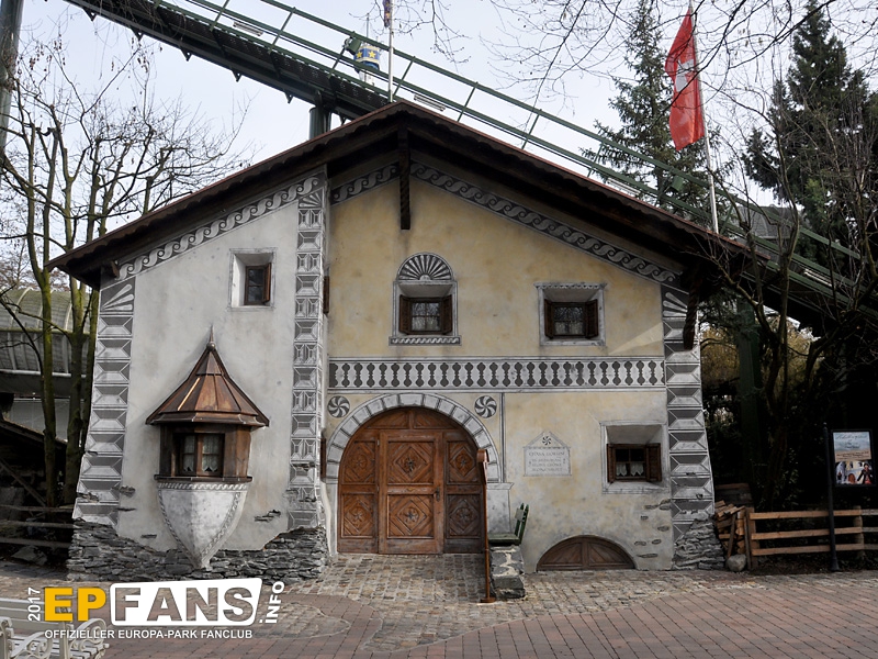 Wir springen nochmals ein wenig und landen direkt vor dem Schellen Ursli Haus. Bisher war es wirklich schwer, das Haus komplett zu fotografieren, da der Weg vor dem Gebäude recht schmal war. Lösung: Man macht einfach den Weg breiter! ;-) Und wenn das immer noch nicht reicht, dann muss schon mal eine Halbinsel her, um den Platz über dem dortigen Bach zu nutzen.