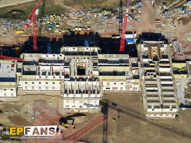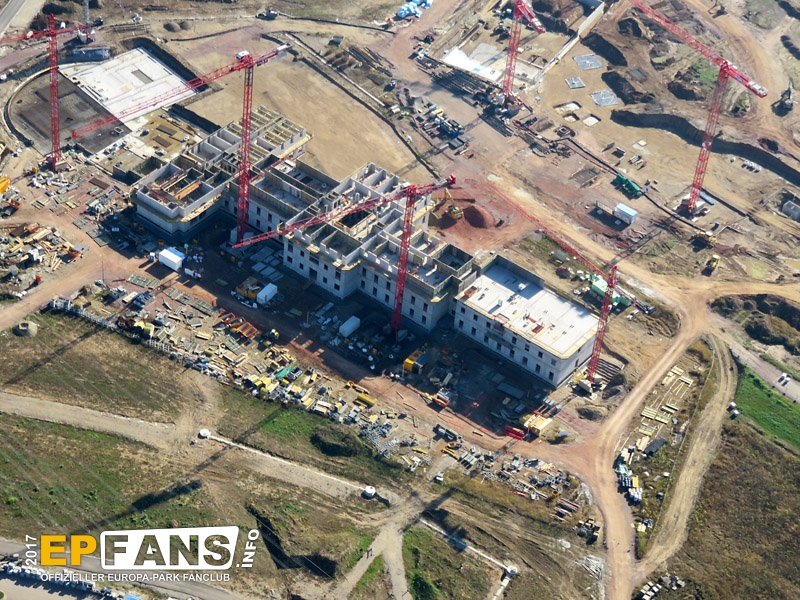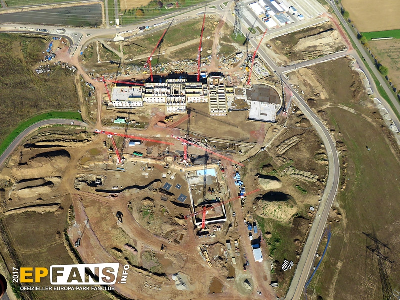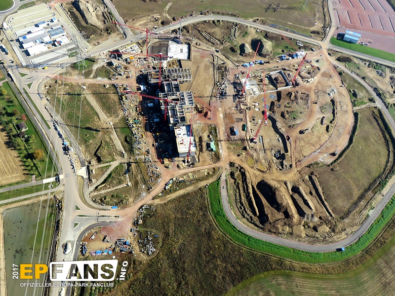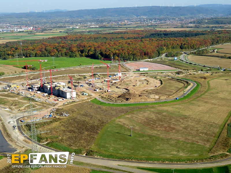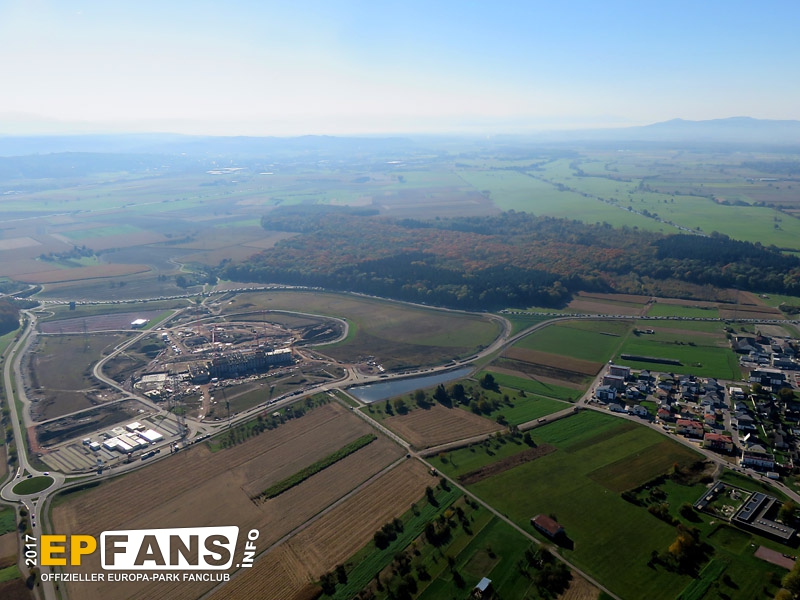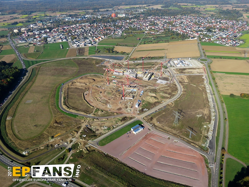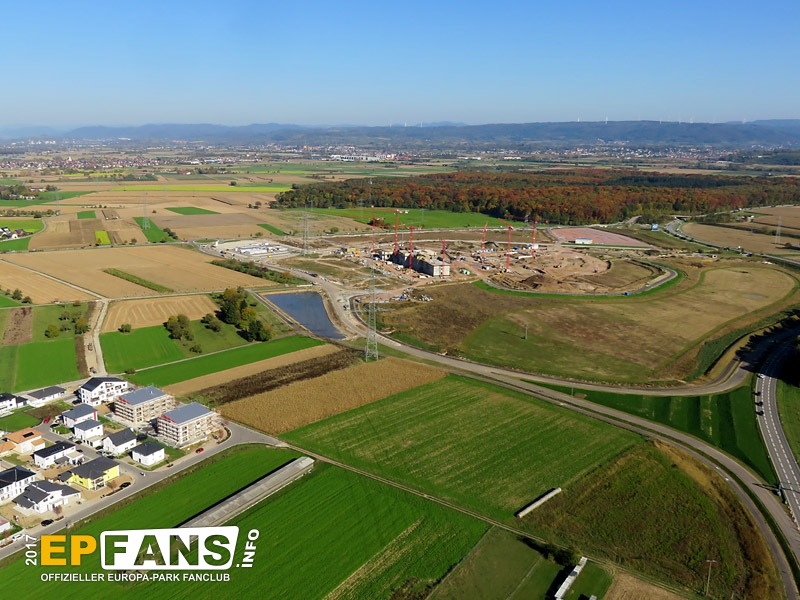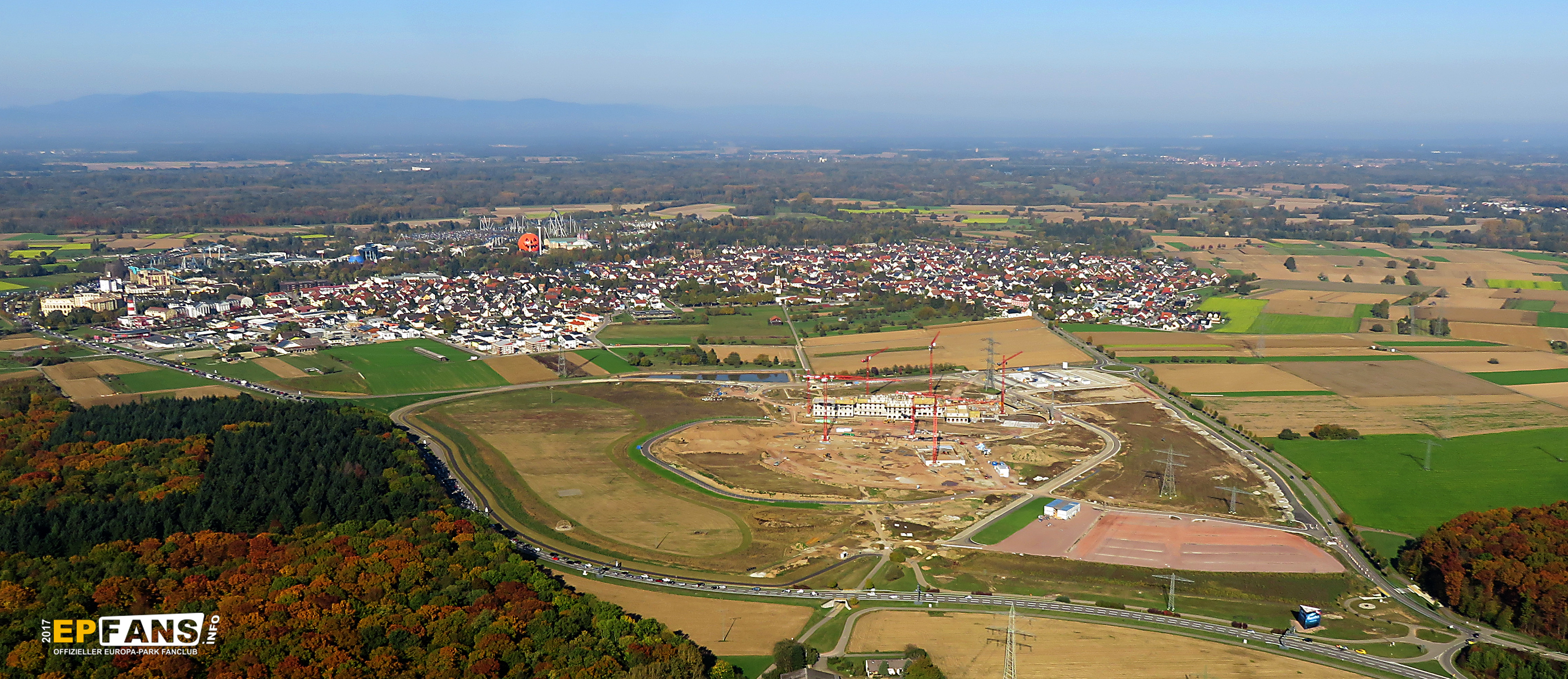 | Blick auf die Rulantica-Baustelle und die Gemeinde Rust mit Europa-Park im Hintergrund. (zum Vergrößern anklicken, ca. 4 MB!) |