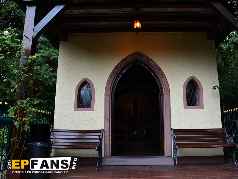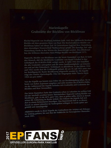 |  |  |  | BöcklinkapelleNiederlande - Der ein oder andere nimmt die kleine Kapelle vermutlich bei seinem Besuch gar nicht wahr, da sie ein bisschen abseits vom Weg liegt. Sie befindet sich gegenüber vom Mini-Scooter bzw. neben der Attraktion "Der fliegende Holländer".Info-Tafel des Europa-Park: Marienkapelle Grabstätte der Böcklins von Böcklinsau Bischof Ruprecht von Straßburg belehnte Ende 1442 den Edelknecht Bernhard Böcklin mit dem gesamten Bann von Rust. Die Reichsfreiherren Böcklin von Böcklinsau haben seit dieser Zeit 18 Generationen lang auf ihrer Stammburg, dem ehemaligen Wasserschloss „Balthasarburg“ gelebt. Die damalige Tief- oder Wasserburg wurde in den Wirren des Bauernkriegs zerstört. Den Wiederaufbau des Schlosses übernahm Hans-Philipp Böcklin von Böcklinsau 1575 Ruprecht, Böcklin von Böcklinsau war der letzte Stammherr von Rust. Er hatte den Wunsch, dass die Böcklinsche Grabstätte vom Ruster Friedhof in den Schlosspark des Europa-Park verlegt wurde. Er fasste 1943 den Entschluss, die alte Grabstätte aufzugeben und die toten Familienmitglieder zu exhumieren und auf den Finkenbuck / Schlosspark zu überführen. In den Jahren 1954 und 1955 wurde dort die Grabkapelle gebaut, die am 10. Juli 1955 unter starker Beteiligung der Ruster Bevölkerung eingeweiht worden ist. Die Kapelle trägt den Namen Marienkapelle. Über der Eingangstür steht: „Sancta Maria 1954 ora pro nobis“. Von der Kapelle aus konnte man früher bis zur Hochkönigsburg sehen. Sie ist heute von hohen Zypressen umgeben und steht inmitten des Europa-Parks. An der Außenwand der Kapelle befinden sich Grabtafeln und Grabsteine der Böcklins und ihrer Verwandten. Der letzte Stammherr hatte den Grabstein schon zu Lebzeiten im rechten Feld mit der Inschrift versehen lassen: „Reichsfreiherr Ruprecht Ludwig Böcklin von Böcklinsau, geb. 21.06.1875, gest.“ Der, dem es gelten sollte, feierte ja damals seinen 80. Geburtstag im Ruster Schloss. Der Erbauer der Kapelle ließ sich dort in einem Eichenstamm beerdigen. Den Baumstamm ließ er zu diesem Zweck zu seinen Lebzeiten im Taubergießen schlagen. Er wurde später ausgehöhlt und zurechtgesägt. Alljährlich wurde in dieser Kapelle der Gottesdienst der Artisten mit Zirkuspater Schönig gefeiert, bis zum Bau der Stabkirche im Norwegischen Themenbereich 1991.