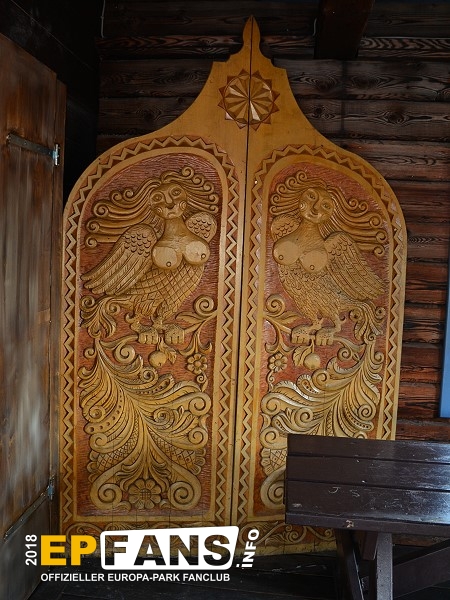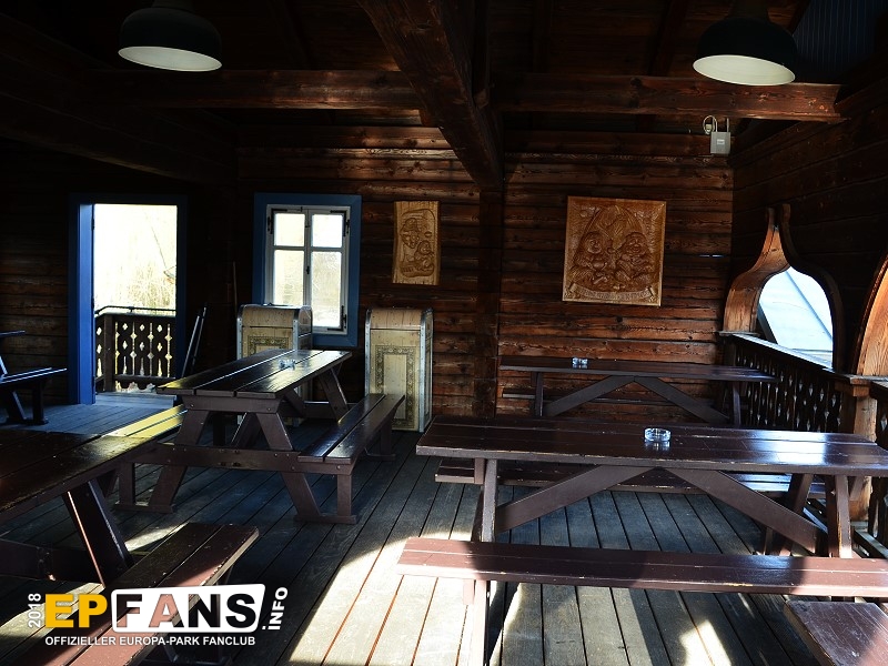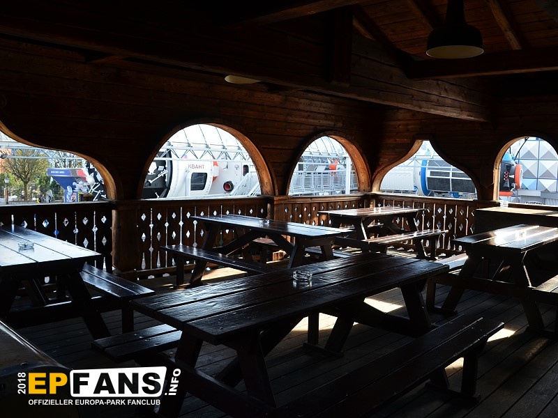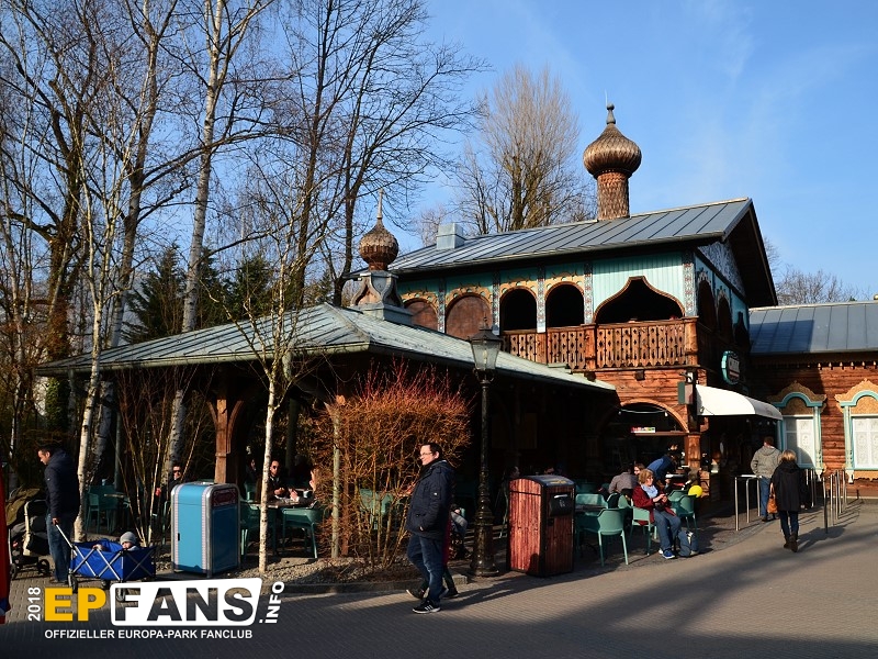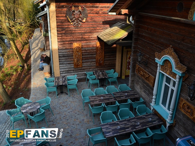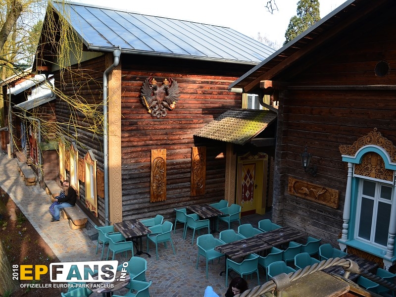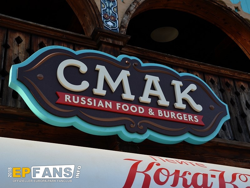 CMAK - Russian Food & BurgersRussland - Der Imbiss "CMAK - Russian Food & Burgers" wurde zum Saisonstart 2018 neu eröffent. Er ersetzt den bisherigen Imbiss "Euro-Mir-Burger". Zum Angebot zählen Spezialitäten aus Mütterchen Russlands Küche wie z.B. Borschtsch, Pelmeni mit Schmand sowie diverse Salate. Auch Burger wie z.B. die Europa-Park Burger Kreation "WODAN Bacon Burger" sind an diesem Imbiss im Angebot. Der Imbiss hat zahlreiche Sitzmöglichkeiten. Einige befinden sich ein bisschen versteckt hinter und über dem Imbiss. Ein Hinweisschild zeigt den Weg zu diesen beiden Sitzbereichen.