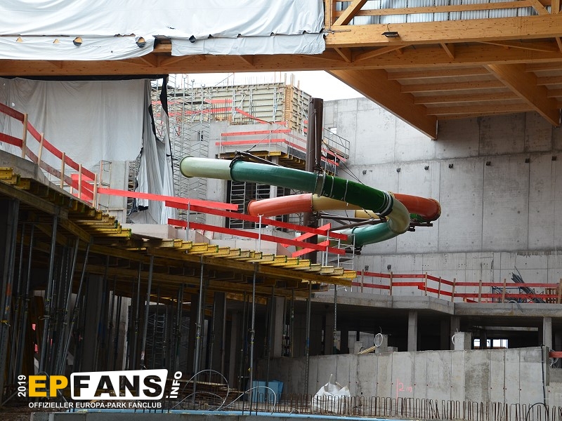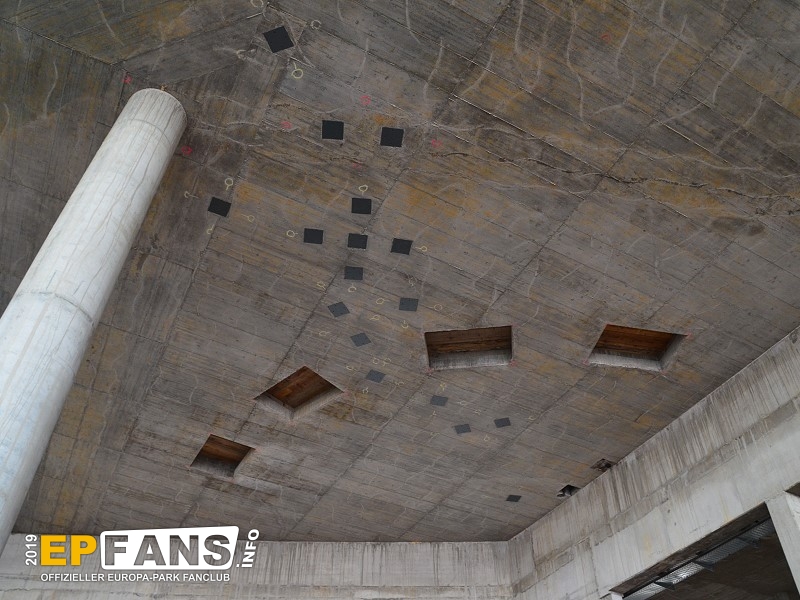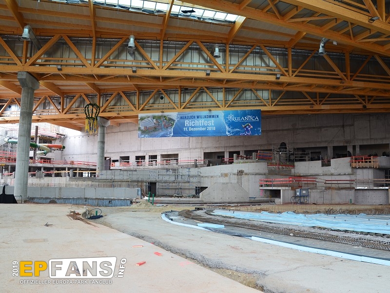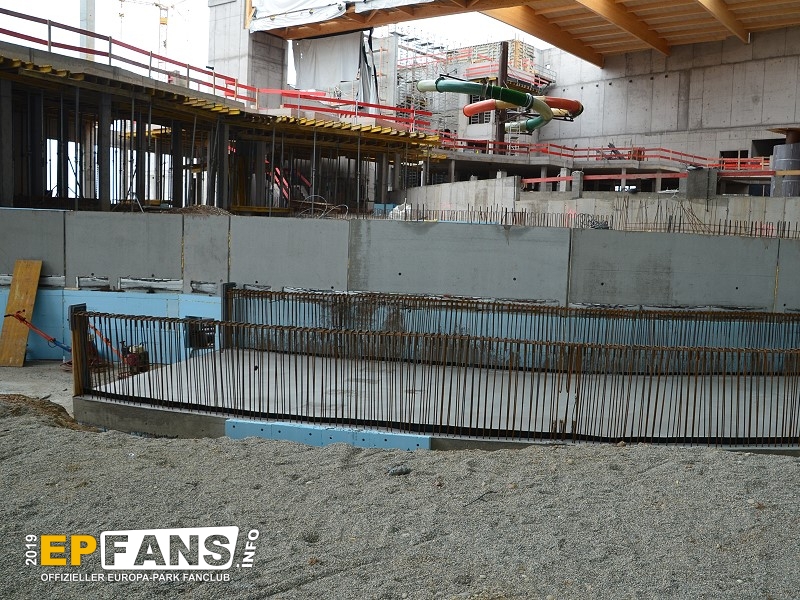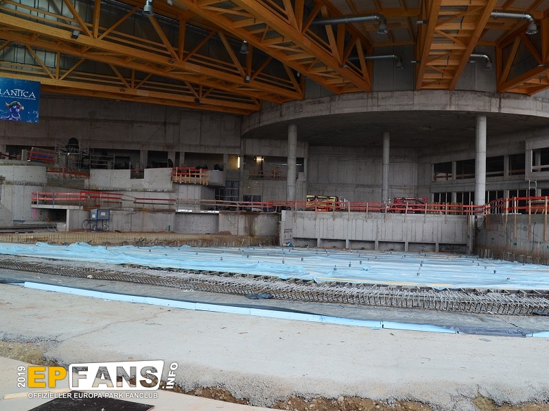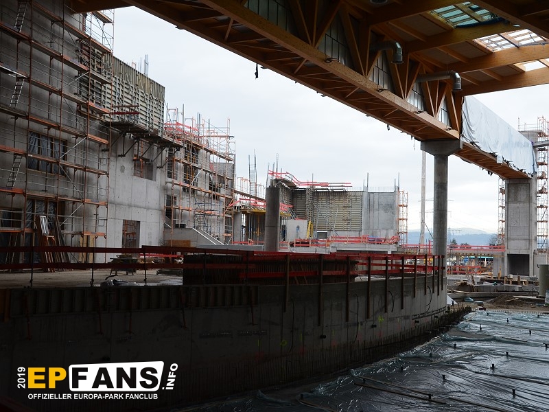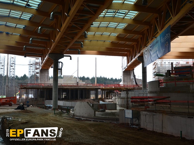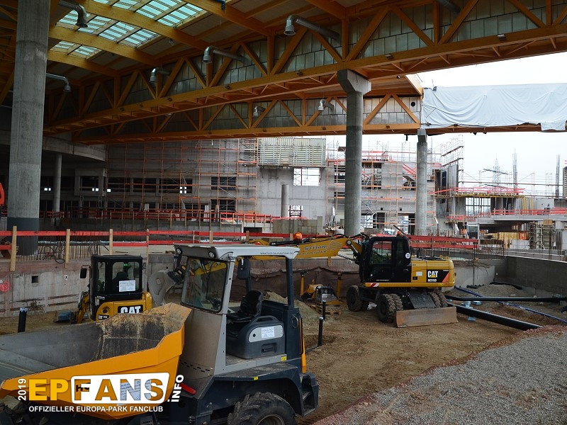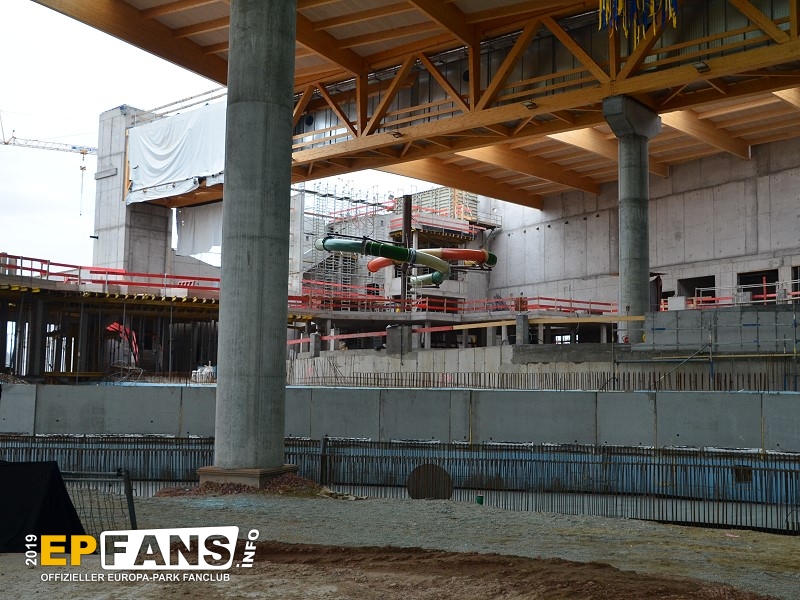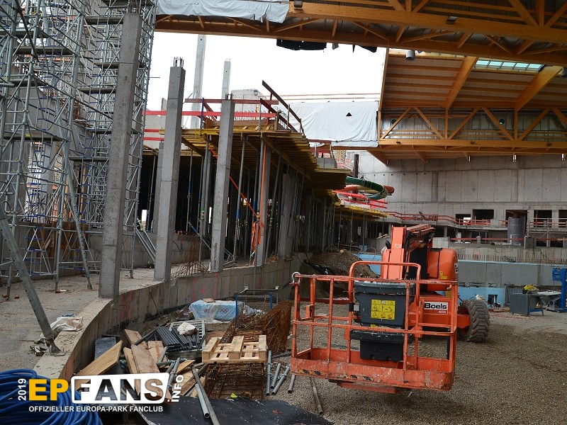 Von der Rutschenlagerfläche liefen wir zum Punkt 1 vor der Rulantica Halle, wo die Fotos 8-12 entstanden. Draußen dominieren noch Baufahrzeuge und Baumaterialien das Bild. Der Bau an den Außenbecken hat noch nicht begonnen. Im Vergleich zum Richtfest sind allerdings mittlerweile die ersten Fensterscheiben bei der Halle eingebaut worden. Wir gingen dann zum Punkt 2. Hier entsteht der Bereich "Skip Strand". Dort wo jetzt noch Baumaschinen stehen ist zukünftig ein Abenteuerpool mit Rutschen und der Möglichkeit zum Toben und Planschen. Die Bilder 13-16 zeigen den Bereich "Skip Strand". Um diesen herum wird ein Teil des Lazy River führen. Auf Bild 17 ist der Rohbau vom Rutschenturm im Bereich "Vinterhal" zu sehen. Dieser Bereich wird ein Gletscherberg sein. Die 8 Cabañas entstehen ganz links auf dem Bild 18. Den zweiten Rutschenturm mit den ersten, montierten Rutschenelementen sieht man auf den Bildern 19-20. Die nächste Station der Tour (Punkt 3) war nur wenige Meter weiter vor dem Wellenbecken (Bilder 21-22). Die Bilder 23-26 zeigen die beiden Rutschentürme nochmals aus einer etwas anderen Perspektive. Der Bereich "Trolldal" liegt etwas höher als das Wellenbecken und ist auf dem Foto 27 zu sehen. Hier entstehen bereits die ersten Felsen (Bild 28-29). Das Bild 30 zeigt den Bereich, wo ein Pizza und Pasta Restaurant entstehen wird und auf Bild 31 sieht man den Blick in Richtung "Skip Strand". Als nächstes liefen wir über eine Rampe in das Kellergeschoss unter der Schwimmhalle. Hier sahen wir bereits Unmengen von Kabelpritschen und Rohren. Hut ab vor demjenigen, der hier den Überblick behält. Im Keller befindet sich auch die Filteranlage. Die Bilder 32 und 33 zeigen nur einen ganz kleinen Teil der riesigen Anlage, die wir bestaunen durften. Vom Keller ging es wieder hinauf zum Punkt 4 der Führung. Dort wird sich zukünftig das Pizza und Pasta Restaurant befinden. Es soll ein Front-Cooking Konzept ähnlich wie bei Vapiano geben. Die Bilder 34-35 zeigen den derzeitigen Zustand. Uns wurde ein bisschen zur Gestaltung verraten, aber das wollen wir an dieser Stelle erst einmal für uns behalten, damit es auch noch ein paar Überraschungen für euch gibt. Unser Weg führte noch einmal in die Schwimmhalle zum Punkt 5. Diesmal standen wir auf der anderen Seite des Wellenbeckens (Bild 36). Auf den Bildern 37 und 38 sieht man den Bereich "Lumåfals" und den dortigen Bereich vom Lazy River, der sich hinter dem Wellenbecken befindet. Ein Blick an die Decke zeigt das geschlossene Dach der Halle und einige Markierungen für den weiteren Bau im Bereich "Lumåfals" (Bild 39 und 40). Einer der Zugänge zur Wasserwelt von den Umkleiden aus ist auf Bild 41 zu sehen. Das Pizza und Pasta Restaurant wird sich hinter den Planen auf Bild 42 befinden. Die letzten beiden Fotos vom Punkt 5 aus zeigen einmal den Blick zum Bereich "Vinterhal" (Bild 43) und einmal in Richtung der 8 Cabañas (Bild 44). Die letzte Station im Gebäude war der Punkt 6. Hier befindet sich das Eingangsgebäude der Wasserwelt, wo alle Badegäste ankommen. Unten gehen die Tagesgäste hinein und oben die Hotelgäste vom Erlebnishotel Krønåsar. Das Gebäude soll wie eine Fischhalle gestaltet werden (Bilder 45-47). Die letzte Station der Führung war nochmals außen (Punkt 7). Wir liefen durch die zukünftige Eingangstür der Wasserwelt und hatten nochmals einen wunderschönen Blick auf das benachbarte Hotel (Bilder 48-52). Die Bilder 53 und 54 zeigen den Eingang zur Wasserwelt und die Bilder 55-57 die Brückenverbindung zwischen Hotel und Wasserwelt. Die Dimension der Baustelle Wasserwelt ist beeindruckend. Wir sind sehr gespannt, wie alles mit der vollständigen Thematisierung wirkt. Wir bedanken uns beim Europa-Park insbesondere bei Herrn Noel Ebhart und Herrn Christof Zimmermann, dass uns die Baustellenführung ermöglicht wurde und für die Freigabe der Fotos zur Veröffentlichung. Die letzten beiden Fotos (58 und 59) entstanden auf dem Rückweg von der Baustelle zum Park und zeigen das Erlebnishotel Krønåsar von vorne. Für den Bericht über die Baustellentour von epfans.ch bitte hier klicken.