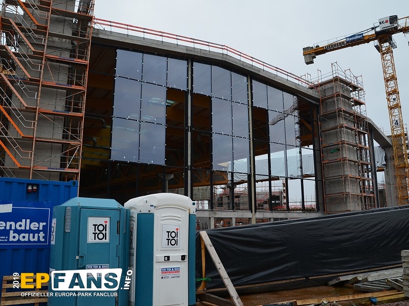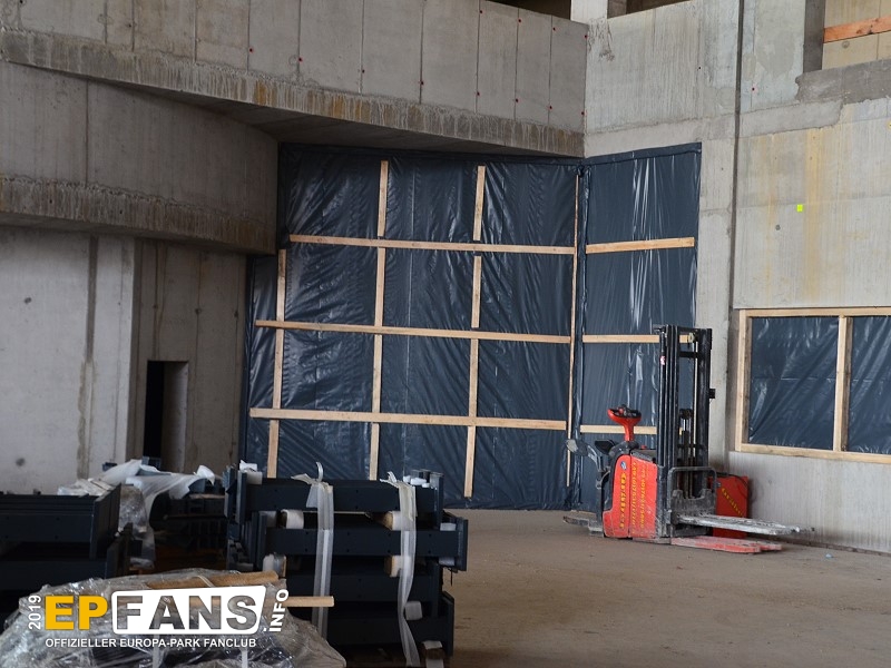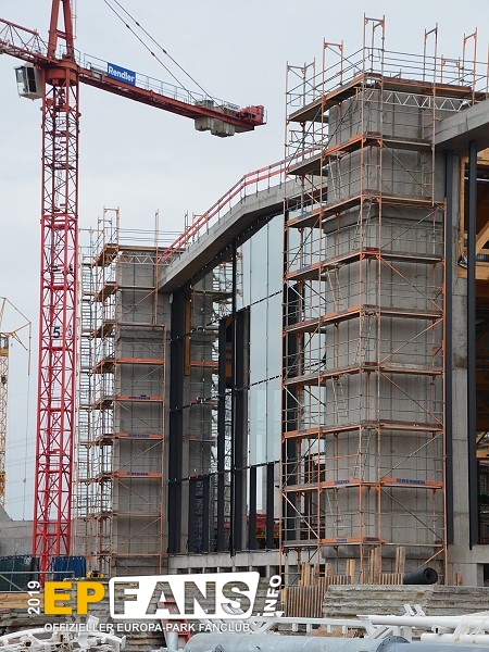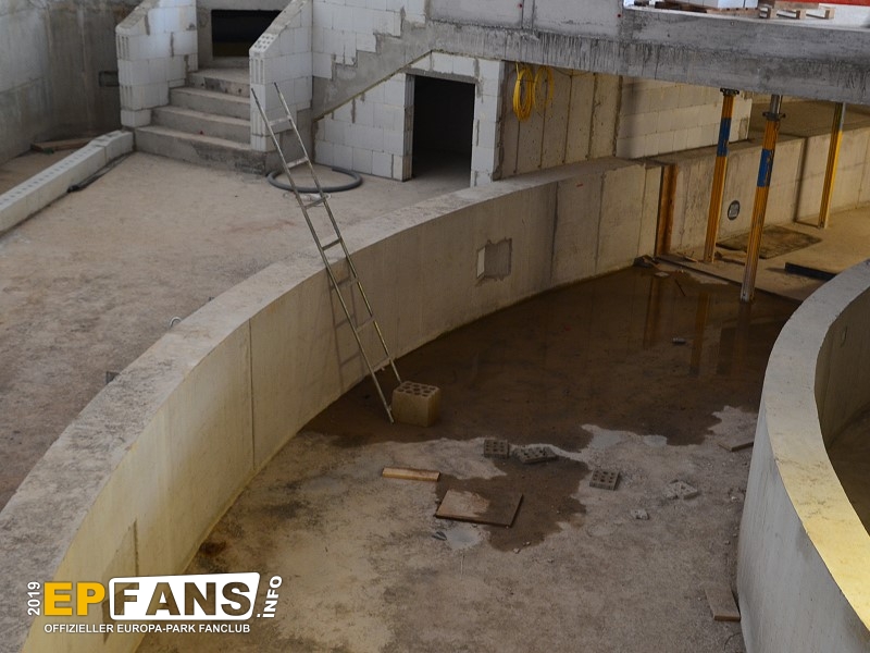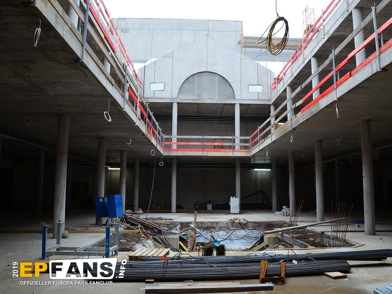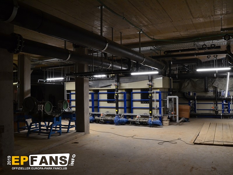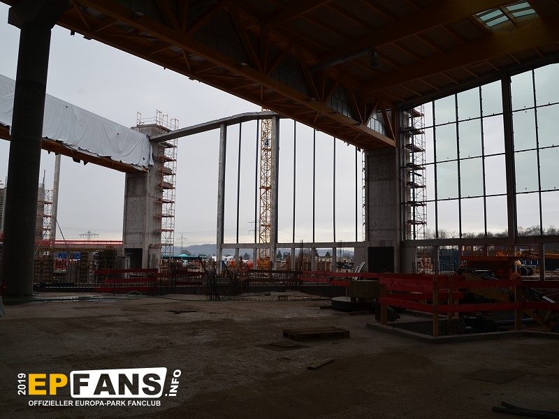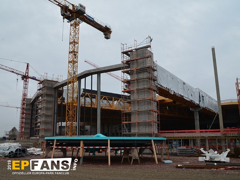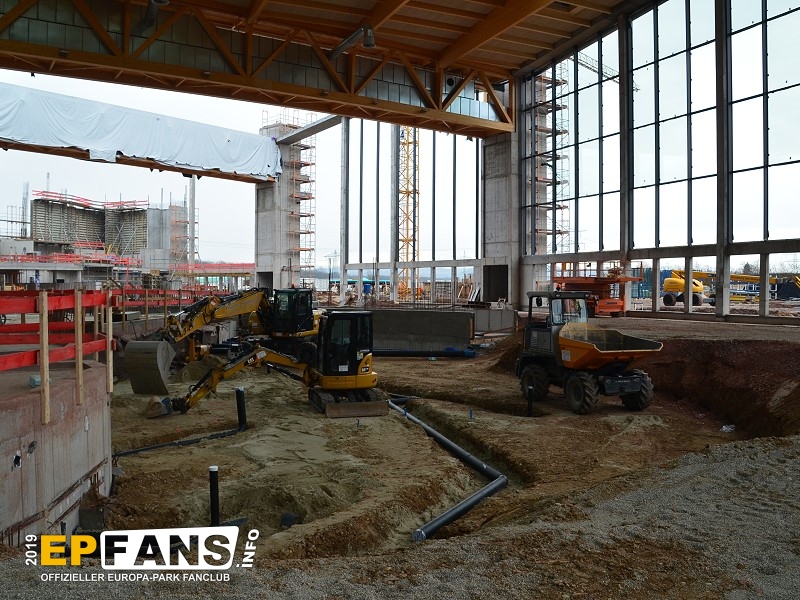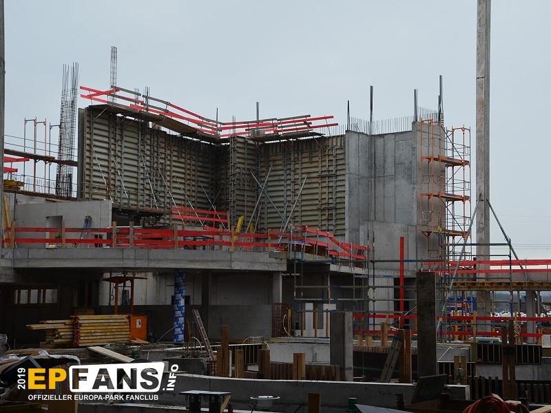 Von der Rutschenlagerfläche liefen wir zum Punkt 1 vor der Rulantica Halle, wo die Fotos 8-12 entstanden. Draußen dominieren noch Baufahrzeuge und Baumaterialien das Bild. Der Bau an den Außenbecken hat noch nicht begonnen. Im Vergleich zum Richtfest sind allerdings mittlerweile die ersten Fensterscheiben bei der Halle eingebaut worden. Wir gingen dann zum Punkt 2. Hier entsteht der Bereich "Skip Strand". Dort wo jetzt noch Baumaschinen stehen ist zukünftig ein Abenteuerpool mit Rutschen und der Möglichkeit zum Toben und Planschen. Die Bilder 13-16 zeigen den Bereich "Skip Strand". Um diesen herum wird ein Teil des Lazy River führen. Auf Bild 17 ist der Rohbau vom Rutschenturm im Bereich "Vinterhal" zu sehen. Dieser Bereich wird ein Gletscherberg sein. Die 8 Cabañas entstehen ganz links auf dem Bild 18. Den zweiten Rutschenturm mit den ersten, montierten Rutschenelementen sieht man auf den Bildern 19-20. Die nächste Station der Tour (Punkt 3) war nur wenige Meter weiter vor dem Wellenbecken (Bilder 21-22). Die Bilder 23-26 zeigen die beiden Rutschentürme nochmals aus einer etwas anderen Perspektive. Der Bereich "Trolldal" liegt etwas höher als das Wellenbecken und ist auf dem Foto 27 zu sehen. Hier entstehen bereits die ersten Felsen (Bild 28-29). Das Bild 30 zeigt den Bereich, wo ein Pizza und Pasta Restaurant entstehen wird und auf Bild 31 sieht man den Blick in Richtung "Skip Strand". Als nächstes liefen wir über eine Rampe in das Kellergeschoss unter der Schwimmhalle. Hier sahen wir bereits Unmengen von Kabelpritschen und Rohren. Hut ab vor demjenigen, der hier den Überblick behält. Im Keller befindet sich auch die Filteranlage. Die Bilder 32 und 33 zeigen nur einen ganz kleinen Teil der riesigen Anlage, die wir bestaunen durften. Vom Keller ging es wieder hinauf zum Punkt 4 der Führung. Dort wird sich zukünftig das Pizza und Pasta Restaurant befinden. Es soll ein Front-Cooking Konzept ähnlich wie bei Vapiano geben. Die Bilder 34-35 zeigen den derzeitigen Zustand. Uns wurde ein bisschen zur Gestaltung verraten, aber das wollen wir an dieser Stelle erst einmal für uns behalten, damit es auch noch ein paar Überraschungen für euch gibt. Unser Weg führte noch einmal in die Schwimmhalle zum Punkt 5. Diesmal standen wir auf der anderen Seite des Wellenbeckens (Bild 36). Auf den Bildern 37 und 38 sieht man den Bereich "Lumåfals" und den dortigen Bereich vom Lazy River, der sich hinter dem Wellenbecken befindet. Ein Blick an die Decke zeigt das geschlossene Dach der Halle und einige Markierungen für den weiteren Bau im Bereich "Lumåfals" (Bild 39 und 40). Einer der Zugänge zur Wasserwelt von den Umkleiden aus ist auf Bild 41 zu sehen. Das Pizza und Pasta Restaurant wird sich hinter den Planen auf Bild 42 befinden. Die letzten beiden Fotos vom Punkt 5 aus zeigen einmal den Blick zum Bereich "Vinterhal" (Bild 43) und einmal in Richtung der 8 Cabañas (Bild 44). Die letzte Station im Gebäude war der Punkt 6. Hier befindet sich das Eingangsgebäude der Wasserwelt, wo alle Badegäste ankommen. Unten gehen die Tagesgäste hinein und oben die Hotelgäste vom Erlebnishotel Krønåsar. Das Gebäude soll wie eine Fischhalle gestaltet werden (Bilder 45-47). Die letzte Station der Führung war nochmals außen (Punkt 7). Wir liefen durch die zukünftige Eingangstür der Wasserwelt und hatten nochmals einen wunderschönen Blick auf das benachbarte Hotel (Bilder 48-52). Die Bilder 53 und 54 zeigen den Eingang zur Wasserwelt und die Bilder 55-57 die Brückenverbindung zwischen Hotel und Wasserwelt. Die Dimension der Baustelle Wasserwelt ist beeindruckend. Wir sind sehr gespannt, wie alles mit der vollständigen Thematisierung wirkt. Wir bedanken uns beim Europa-Park insbesondere bei Herrn Noel Ebhart und Herrn Christof Zimmermann, dass uns die Baustellenführung ermöglicht wurde und für die Freigabe der Fotos zur Veröffentlichung. Die letzten beiden Fotos (58 und 59) entstanden auf dem Rückweg von der Baustelle zum Park und zeigen das Erlebnishotel Krønåsar von vorne. Für den Bericht über die Baustellentour von epfans.ch bitte hier klicken.