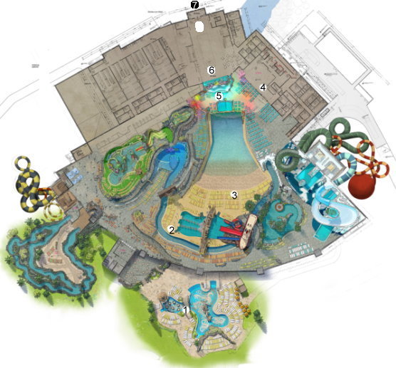 Bevor die Tour beginnen konnte, erhielten erst einmal alle einen Schutzhelm. Schließlich betraten wir eine Baustelle mit Helmpflicht. Unsere erste Station war die Lagerfläche der Rutschenelemente. Diese konnten wir jedoch nur von außen betrachten. Anschließend ging es dann aber hinter den Bauzaun von Rulantica. Die nachfolgende Übersicht ist eine Orientierungshilfe für die Fotos der Baustellentour. Die meisten Stationen der Tour sind darauf gekennzeichnet.