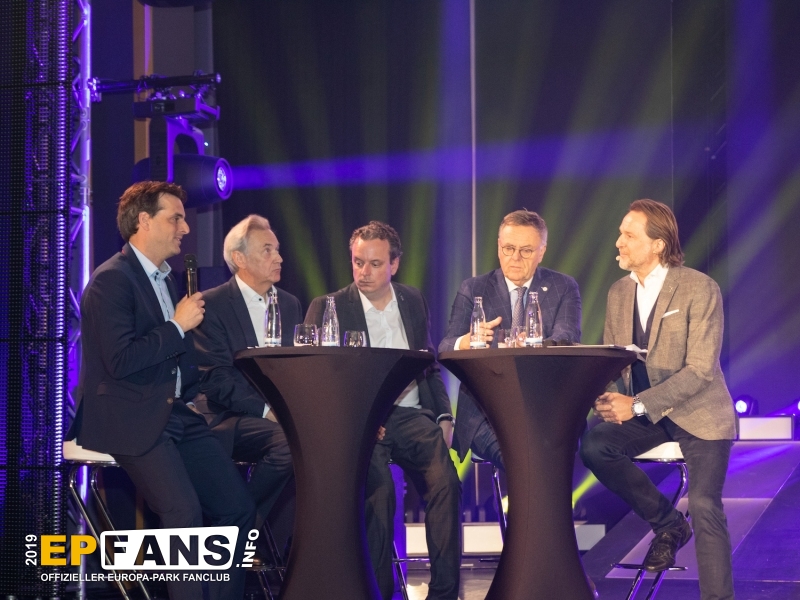 Anschließend lud er die Herren der Familie Mack zum Gespräch auf die Bühne, um die Neuheiten 2019 zu besprechen. Dabei pendelte das Gespräch oft zwischen Rück- und Ausblicken. Dieses Jahr feiern einige wichtige Projekte des Europa-Park Jubiläum: 20 Jahre Castillo Alcazar, 20 Jahre Dinnershow und 10 Jahre Bluefire Megacoaster. Es gibt 2019 auch noch zwei 70jährige Jubiläen, doch über Alter spricht man ja nicht.