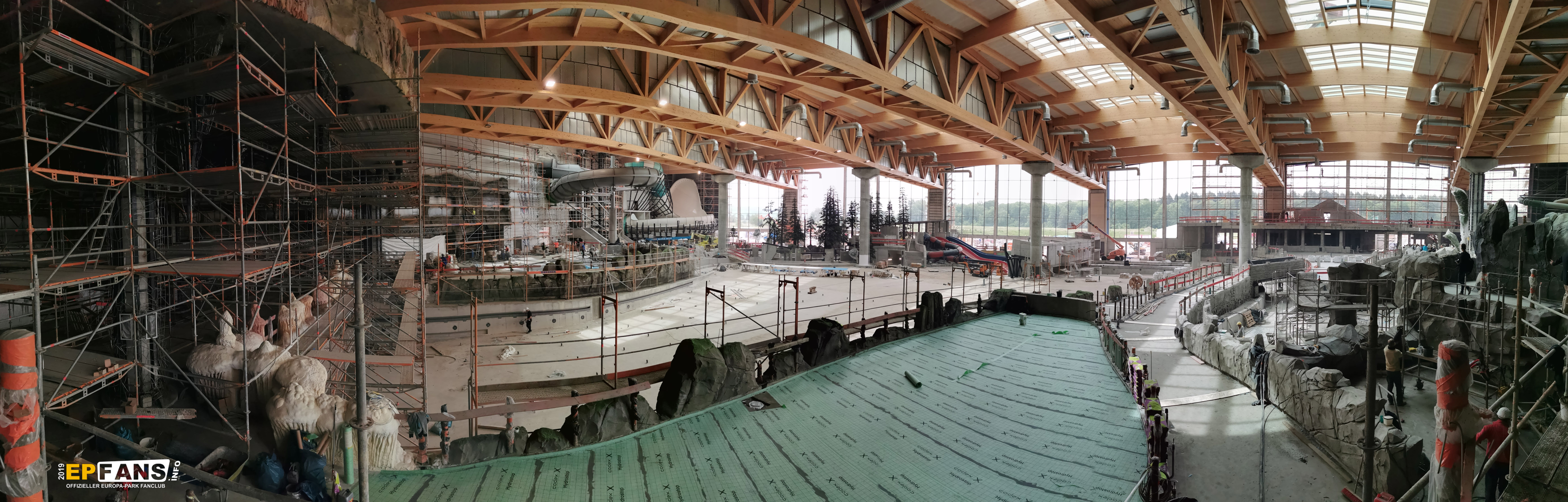 Bevor wir im Bubba Svens einige skandinavische Spezialitäten genießen konnten, stand noch ein besonderer Rundgang auf dem Programm. Es ging über die Fjordbrücke nach…. Rulantica! Es folgen ein paar Eindrücke und interessante Fakten: Betritt man das große Eingangsgebäude, empfängt einen noch viel Rohbau. Kabel und Lüftungskanäle an der Decke, erste Wanddekorationen in Klinkeroptik. Hier wird der Check-in-Bereich sein. Nach rechts geht es zu den Umkleiden und Duschen. Für die Schließfächer wird 1 € verlangt. Dieser wird allerdings bei Shopping oder Gastronomie angerechnet. Im Bad selbst wird mithilfe der RFID-Armbänder alles bargeldlos bezahlt. Eltern können die Kinderarmbänder individuell mit einem Guthaben programmieren, sodass die Kinder nicht selbstständig das komplette-Snorri-Merchandise kaufen können. Bei einigen Rutschen kann man mithilfe des Armbandes eine Foto-Anlage scharf stellen und so am Ende „Onslide“-Fotos ausdrucken. Öffnungszeiten: Rulantica wird regulär von 11:00-22:00 Uhr geöffnet sein. Die Hotelgäste haben wie im Europa-Park gewohnt einen früheren Eintritt ab 10:00 Uhr. Ab 17:00 Uhr soll es ein Abendticket geben, ebenso einen Gruppentarif. Tickets sollen unbedingt online reserviert werden, es werden nur Restkarten an der Tageskasse verkauft. Bei 3500 ist Schluss. Es wird bewusst zu Beginn eine recht einfache Ticketauswahl geben. Evtl. gibt es später mal Änderungen. Jahres- bzw. Clubkarten sind zunächst nicht geplant. Aber gehen wir weiter: Durch noch nüchterne Gänge öffnet sich dann die große Halle und ein WOW geht durch die Reihen. Die Dimensionen sind einfach gigantisch! Links entstehen die Tropfsteine für Lumåfals, den Wasserfall, der das 800 qm große Wellenbecken speist. Vinterhall ist noch nicht vergletschert, aber die Rutschen sind schon beeindruckend. Zahlreiche große Bäume trennen die Skog Lagune vom Actionbereich Skip Strand ab. Überall entstehen Felsen, Bäume und aus schnöden Betonsäulen werden uralte Holzbalken modelliert. Ein feiner Staubnebel liegt in der Luft. Das Trølldal ist am weitesten fortgeschritten, hier schlummern und grinsen schon unzählige Trolle in Felsen und Bäumen. Für Gastronomie und Shoppingbereiche benötigt man im Moment noch etwas Fantasie. Auch von Ragnagkor, der Stadt auf Stelzen mit den exklusiven Komfort Hyddas ist noch nicht viel zu sehen, aber an allen Ecken und Enden wird gebaut und Arbeiter wuseln durch die Halle. Tschuldigung, bitte mal kurz zur Seite, Mann mit Palette! Achtung, Werkzeugkoffer! Das besondere Konzept von Rulantica liegt in der Mischung der Themenbereiche. Gruppen müssen sich nicht groß trennen und dann in der ganzen Halle suchen. Denn Actionbereiche und ruhige Ecken liegen sehr nah beieinander. Während Mama also auf der Sprudelliege relaxt können die Kids rutschen und toben. Jede Rutsche hat eine Kapazität von 300-400 Personen pro Stunde. Allein im Lazy River „Snorri‘s Saga“ kann man 10 Minuten lang durch Rulantica treiben. In gut 6 Monaten ist es dann soweit und wir sind alle sehr gespannt! Rulantica wird groß und GUT, womit wir wieder am Anfang des Berichtes wären. Die Kombination aus Indoor-Wassererlebniswelt und Freizeitpark ist weltweit wirklich einmalig und wir freuen uns auf die zahlreichen Überraschungen, die es im Museumshotel Krønasår und in der geheimnisvollen Sonderausstellung zu Rulantica zu entdecken gibt!