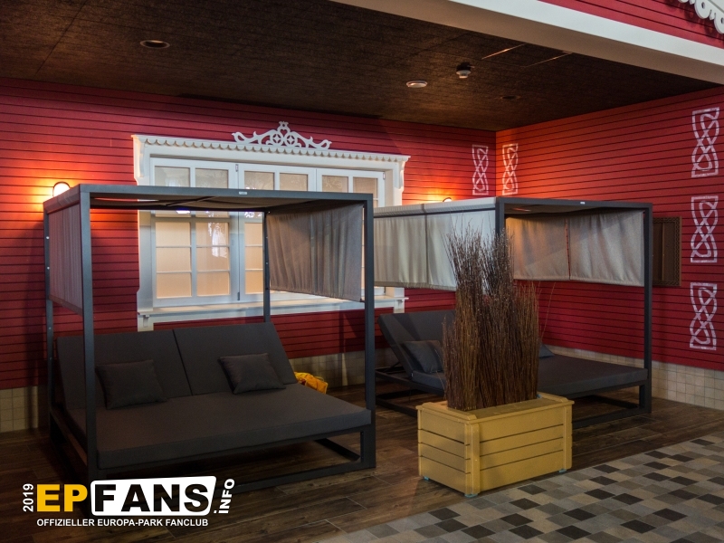 | Von den Komfort Hyddas gibt es sicherlich den besten Blick auf Rulantica. Hier gibt es bequeme Wohlfühlbereiche mit Sitz- und Liegemöglichkeiten, Kühlschrank und persönlichen Service. Gegen einen Aufpreis gibt es Luxus wie im nordischen Götterhimmel. |