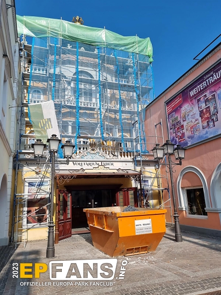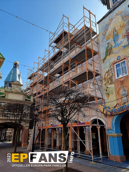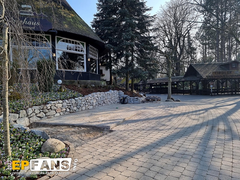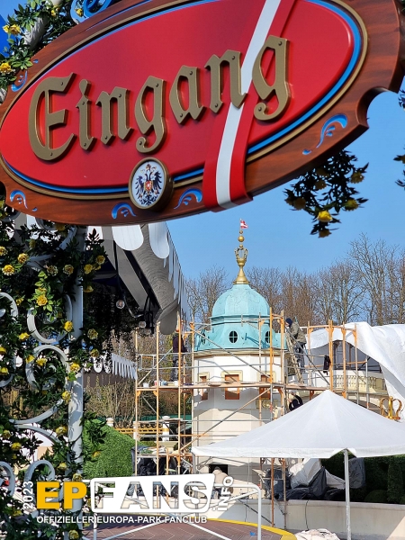 Die genaue Liste mit allen Veränderungen befüllen wir schon fleißig und wird pünktlich zum Saisonstart veröffentlicht. Vorab möchten wir mit dieser kleinen Bilderserie Anfang März einmal auf die verschiedenen Renovierungen oder Bautätigkeiten eingehen, die es im Park zu entdecken gab oder gibt: Ganz oben auf der Liste: "Josefinas kaiserliche Zauberreise". Entgegen den ursprünglichen Planungen wurde dieses Jahr aber nicht das Stationsgebäude erneuert, sondern der "Secret Garden". Aus dem gras- bzw. moosbewachsenen Gärtchen wurde eine kleine Schlosslandschaft mit entsprechender optischer Aufmachung. Ebenfalls in Österreich entsteht ein neuer Imbiss, an dem ausgewählte Speisen aus dem Seehaus-Restaurant "To Go" angeboten werden. Hier auf dem Bild sieht man bisher nur den Platz dafür, der Imbissstand wird erst im Laufe der letzten Woche fertiggestellt. Im Park selbst wurden diverse Fassaden renoviert, die Dächer rund um das Rafting neu gedeckt und technische Arbeiten am Eurotower durchgeführt. (siehe hierzu auch den entsprechenden Blogbeitrag des Europa-Park.) Von der Lärmschutzwand bei Wodan hatten wir ja bereits berichtet. Das war unser erster Blick hinter die momentan verschlossenen Tore des EP. Falls ihr Interesse an der Baustelle des neuen Coasters im zukünftigen kroatischen Themenbereich habt (und das habt ihr selbstverständlich! ;-) ) dann schaut am 23.03. nochmals hier auf der Seite vorbei. Vielleicht machen wir dann ja auch noch eine Reise in ein anderes europäisches Land... :-)