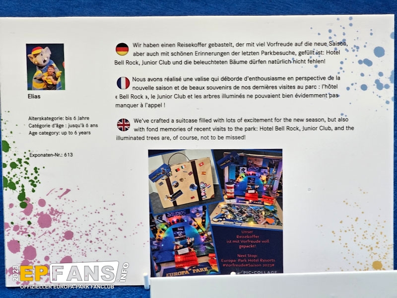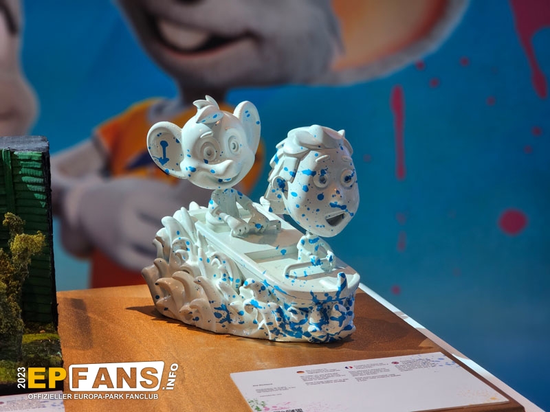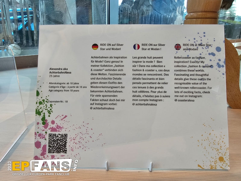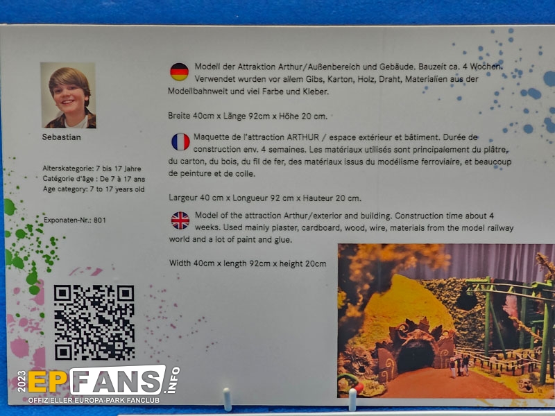 Und unter den 100 Finalisten gab es schließlich noch 5 Teilnehmer, dessen Kreationen die absoluten Spitzenplätze erreicht haben. Die Mitglieder der Jury haben mehrfach betont, dass es so viele gute Ideen gab, dass die Entscheidung der "Top 5" wirklich schwer gefallen war. Am 29.04. folgte schließlich unter Moderation von Wolf Fisher die Feierliche Eröffnung des Art-Boulevards in Verbindung mit der Preisübergabe an die 5 Gewinner. Zur besseren Fairness wurden verschiedene Kategorien geschaffen: Unter 6 Jahre (Gewinner: Elias) 7 - 17 Jahre (Gewinner: Sebastian) ab 18 Jahre (Gewinner Paltz 3, 2 und 1: Alena, Dominiques Farbmanufaktur, Familie Richter) Die glücklichen Sieger wurden im Zuge der Veranstaltung von Vertretern des Europa-Park kurz interviewt und ihre Kreationen vorgestellt. Schaut euch die Ausstellung am Besten selbst einmal an und lasst euch inspirieren von so viel Kreativität der EPFans. Ein kleiner Zusammenschnitt der Veranstaltung haben wir hier für euch bereitgestellt: Wer noch mehr Hintergrundinformationen zu den Kunstwerken und ihre Erschaffung haben möchte kann live in der Ausstellung oder teilweise hier auf den nachfolgenden Bildern die jeweiligen QR-Codes scannen.